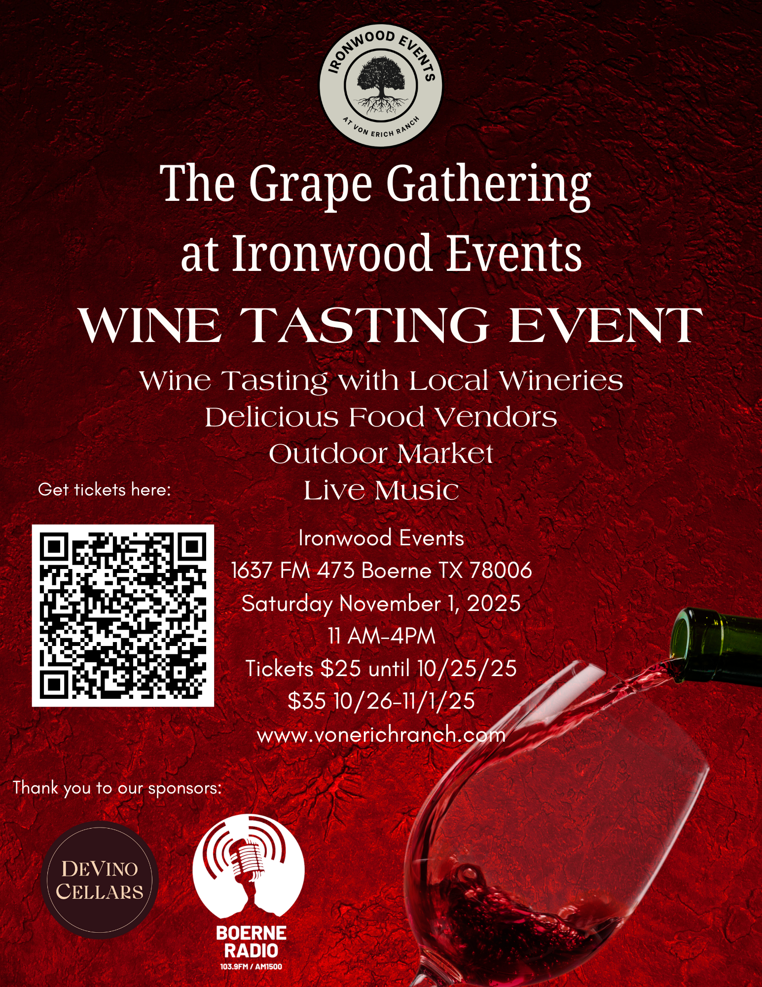 Join us for The Grape Gathering at Ironwood Events on Saturday, November 1, 2025, from 11 AM – 4 PM right here in the Texas Hill Country.