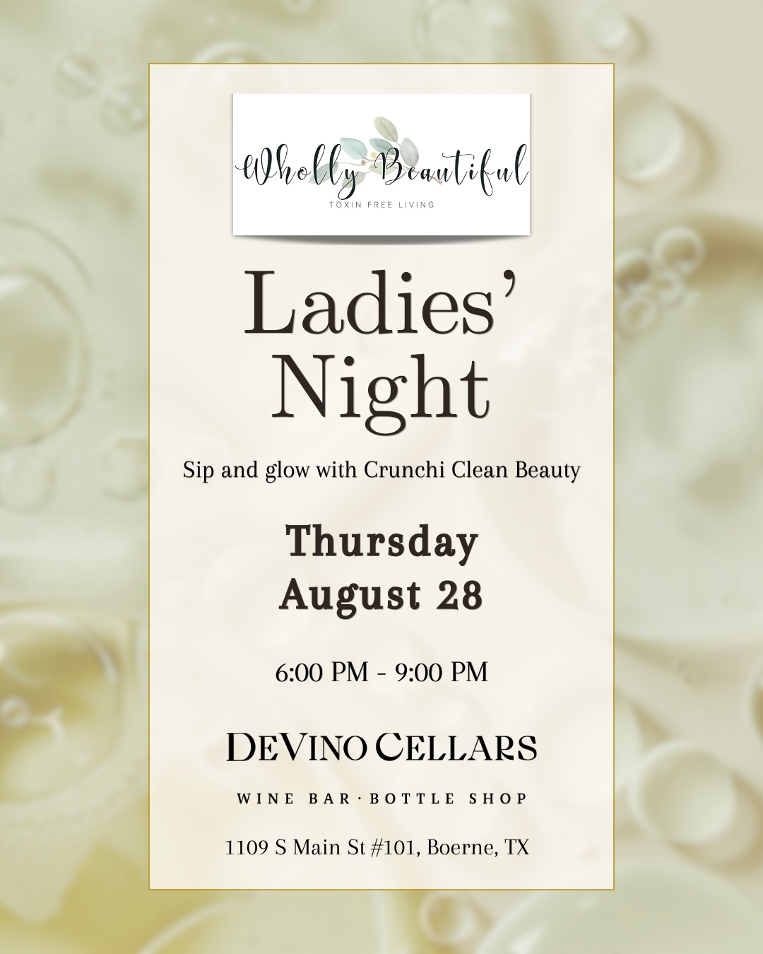 Ladies Night with Crunchi Clean Beauty Join us for Ladies’ Night and discover Crunchi Clean Beauty! Harness the power of red light therapy while nourishing your skin with toxin-free skincare and makeup. + Add to Google Calendar + iCal / Outlook export Date Aug 28 2025 Expired! Time 6:00 pm - 9:00 pm Location DeVino Cellars 1109 S Main, Ste 101 Boerne, TX 78213 Share this event