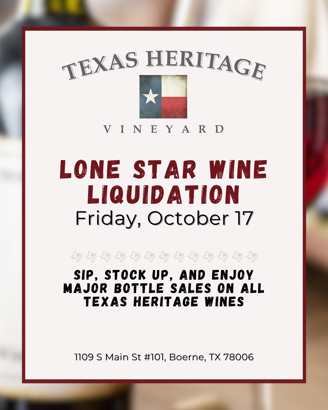 🤠 Join us for the Lone Star Wine Liquidation at DeVino Cellars. Sip, stock up, and enjoy major bottle sales on all Texas Heritage Wines with pours available all day long. 🍷