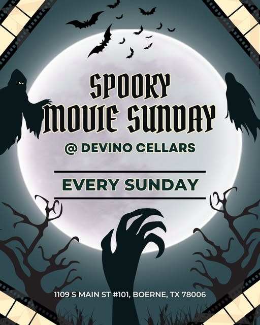 👻 A little spooky fun as we count down to our big Halloween party! Spooky Movie Sunday is here! 👻🍷 Join us at DeVino every Sunday for a hauntingly good film. Pair it with your favorite wine and order in from @trepizzeriaboerne for the perfect pairing.